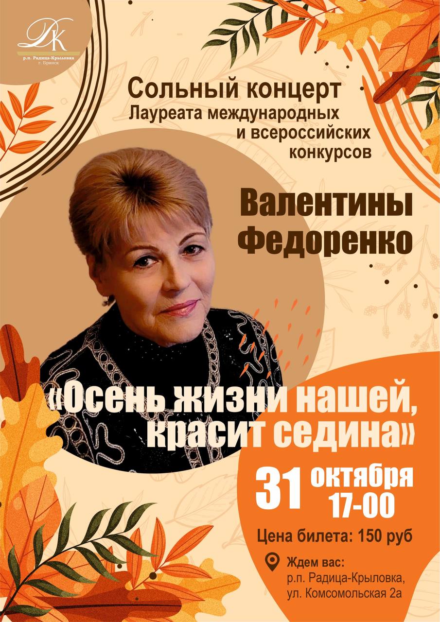 31 октября в 17-00 сольный концерт "Осень жизни нашей, красит седина" Лауреата международных и всероссийских конкурсов Валентины Федоренко.