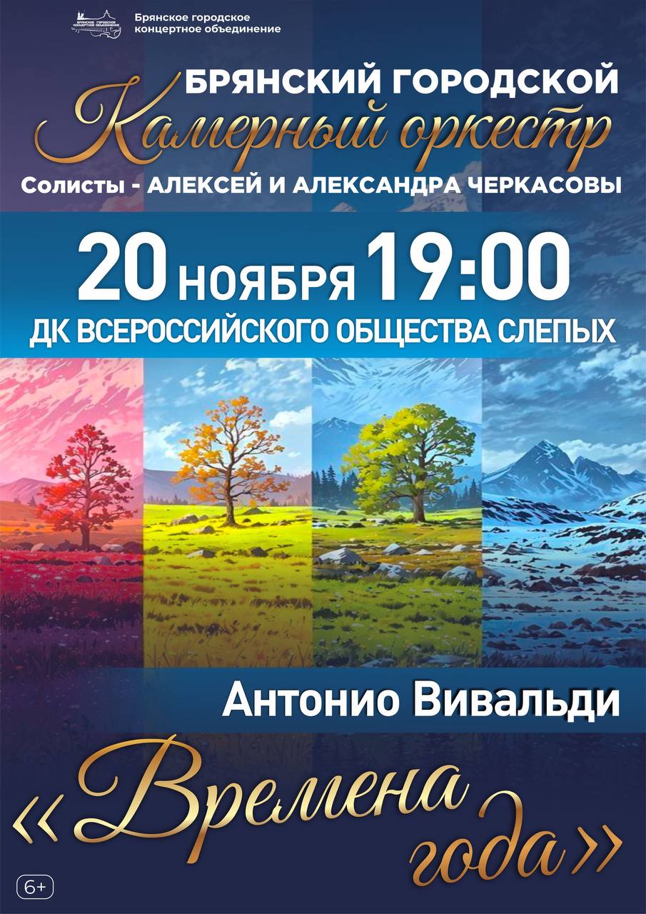 Брянский городской камерный оркестр приглашает Вас окунуться в чарующие звуки природы и магию искусства на концертной программе «Времена года», посвященной творчеству великого итальянского композитора Антонио Вивальди.