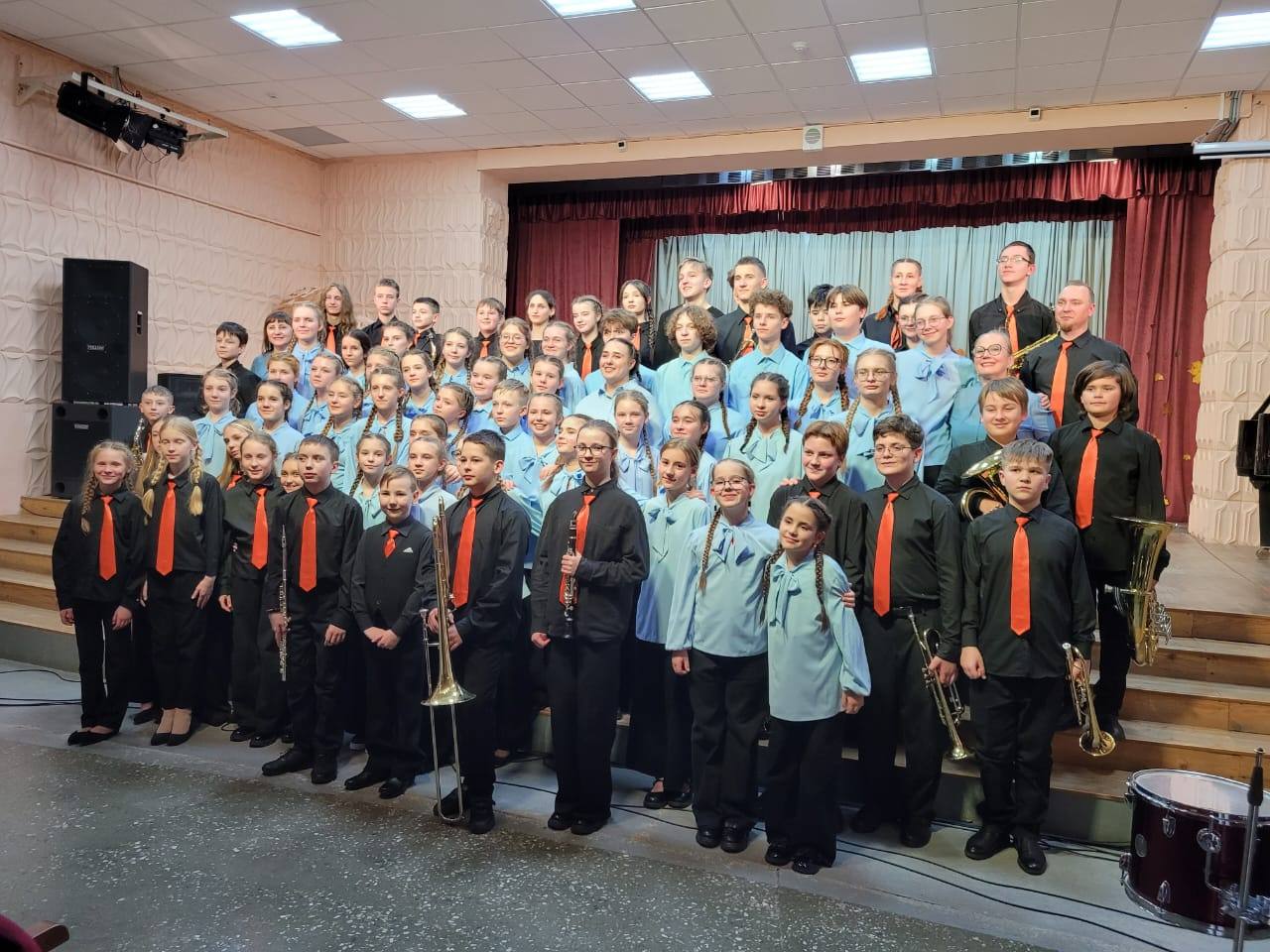 Всех гостей Дятьковской детской школы искусств ждал большой музыкальный сюрприз - совместный концерт духового оркестра Детской школы искусств №1 им.Т.П.Николаевой (руководитель и дирижер Шарков Антон Дмитриевич) и хора старших классов "Апрель" (руководитель Фетисова Наталья Викторовна) в рамках творческого проекта "Музыка великой Победы".