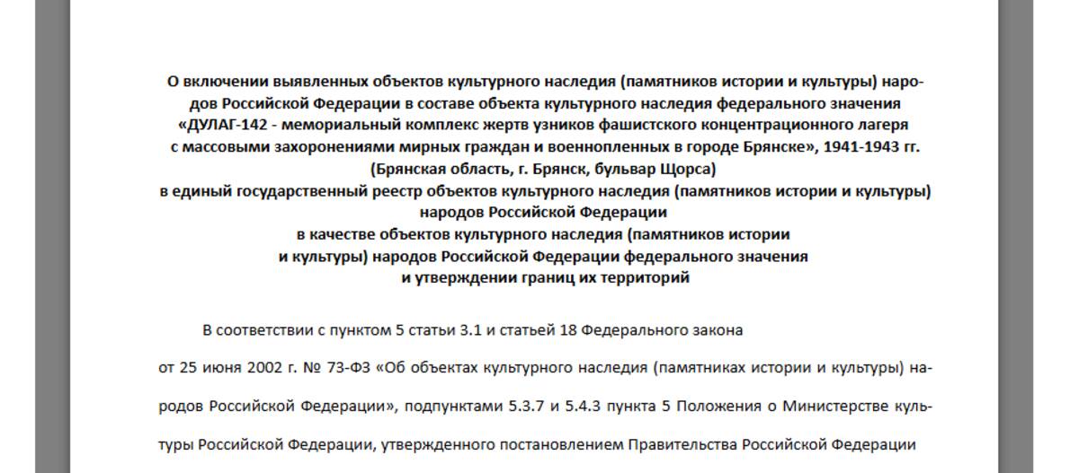 — Включить выявленные объекты культурного наследия ... в составе объекта культурного наследия федерального значения «ДУЛАГ-142 - мемориальный комплекс жертв узников фашистского концентрационного лагеря с массовыми захоронениями мирных граждан и военнопленных в городе Брянске», — указано в тексте приказа министерства культуры Российской Федерации.