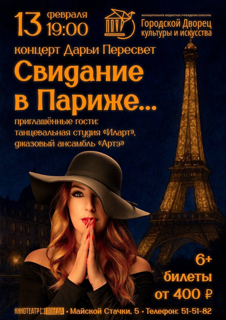 Городской Дворец культуры и искусства предоставит такую уникальную возможность! Очаровательная солистка Дарья Пересвет подготовила концертную программу "Свидание в Париже", полностью состоящую из французской классики! Исполнение всем известных хитов на языке оригинала сделает пятницу в канун Дня влюбленных особенно романтичной.