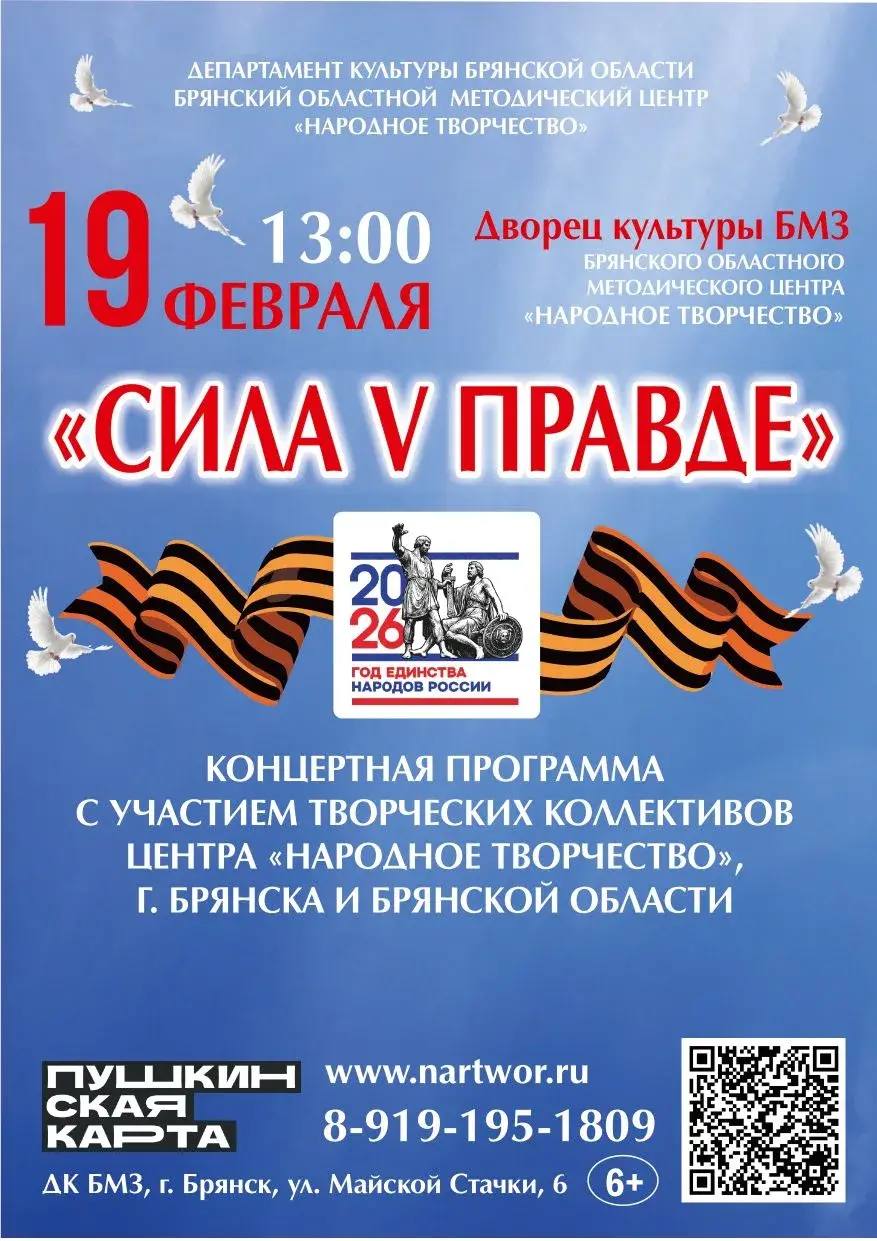 19 февраля 2026 г. в 13.00 во Дворце культуры БМЗ Брянского областного методического центра «Народное творчество» состоится концерт «Сила V Правде!».