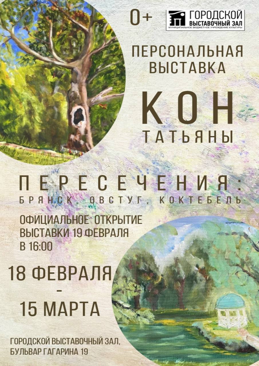 19 февраля в 16:00 состоится торжественное открытие персональной выставки Кон Татьяны Иосифовны «Пересечения: Брянск, Овстуг, Коктебель» в МБУК «Городской выставочный зал» по адресу: бульвар Гагарина, д.19.