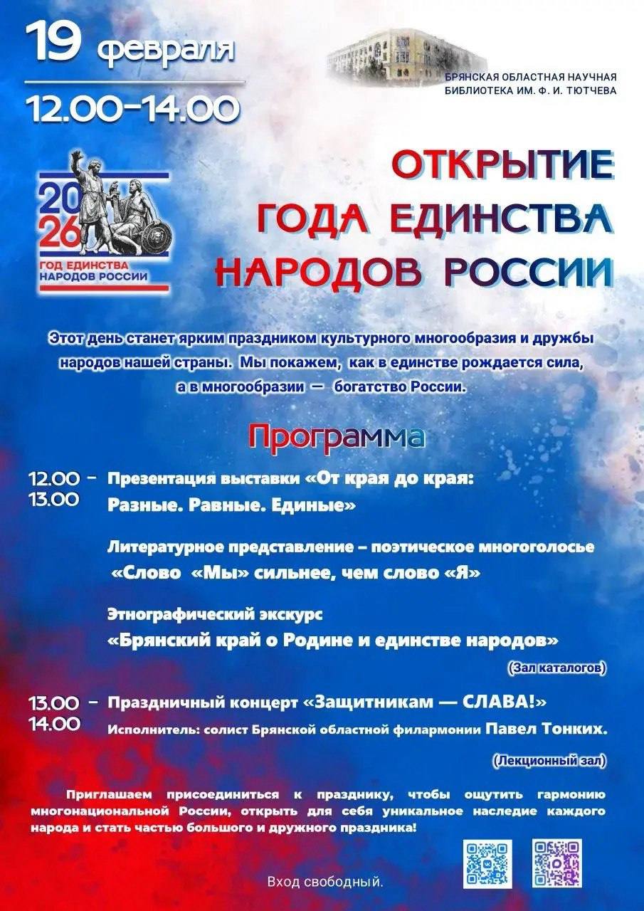 19 февраля в 12.00 в Брянскую областную научную библиотеку им. Ф.И. Тютчева на праздничное событие, посвященное открытию Года единства народов России.