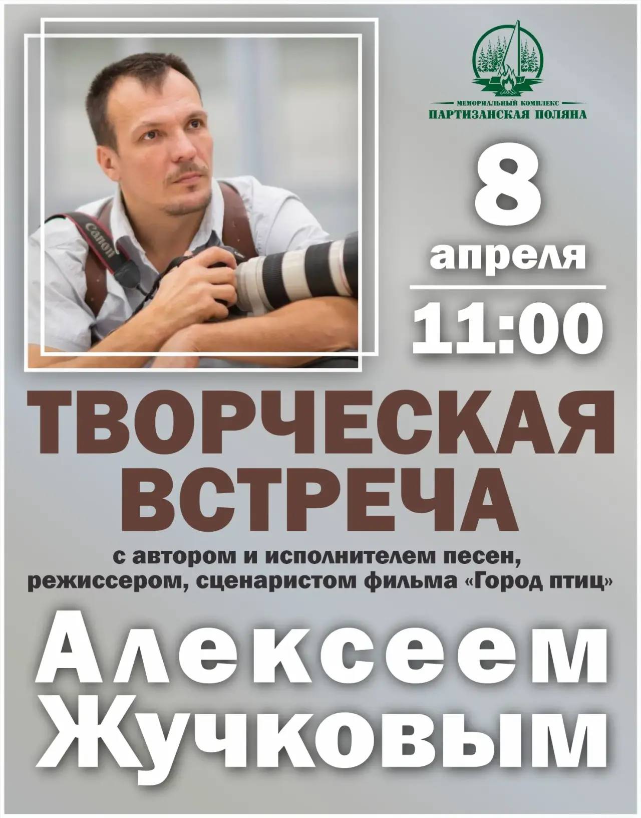 8 апреля в 11.00 в Музее истории партизанского движения МК «Партизанская поляна» состоится творческая встреча с Алексеем Жучковым — автором и исполнителем песен, режиссером, сценаристом фильма «Город птиц».