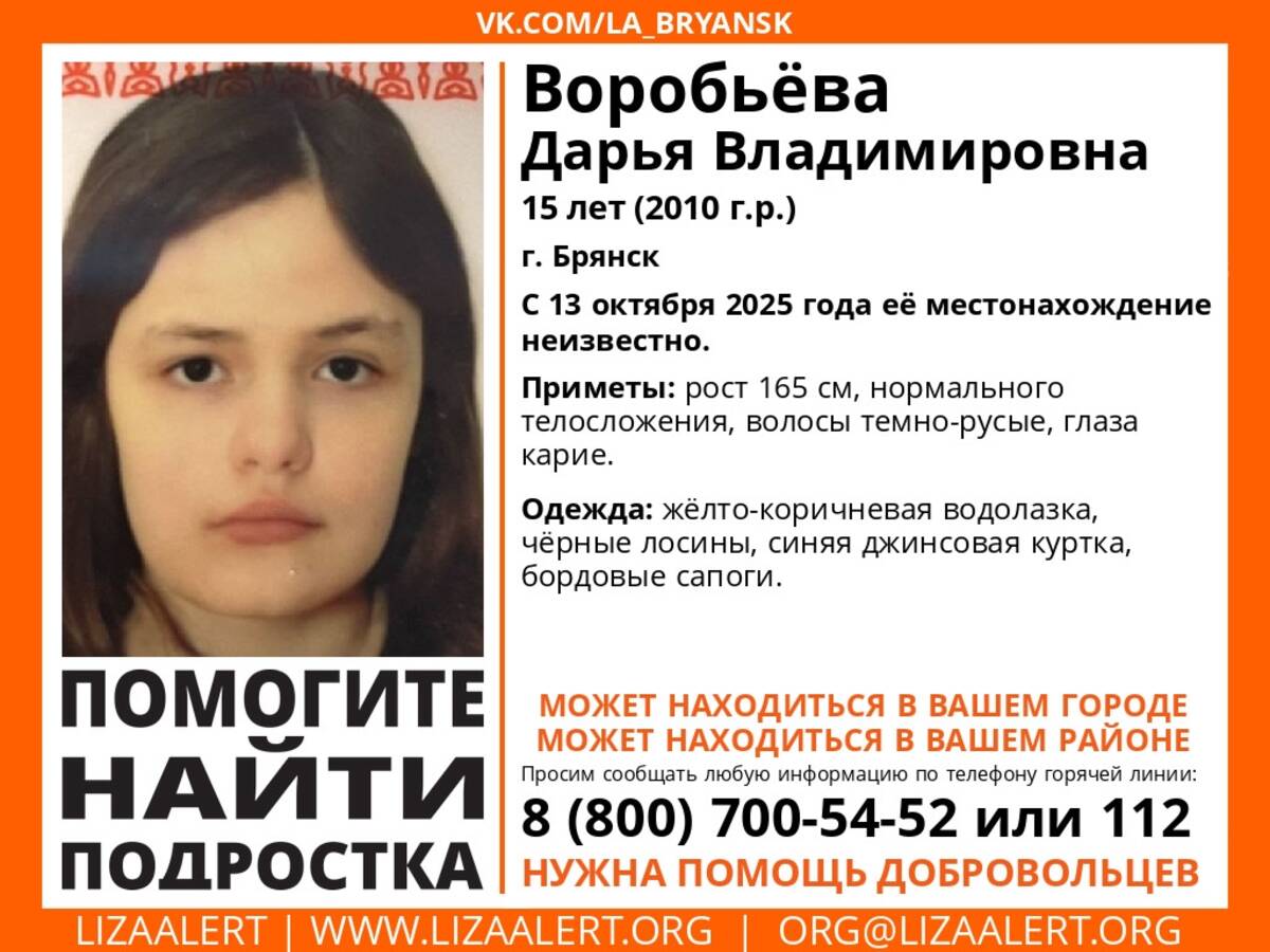 В Брянске отыскали пропавшую 15-летнюю Дарью Воробьёву. Об этом сообщили в соцсетях «Лиза Алерт» вечером в понедельник, 13 октября.