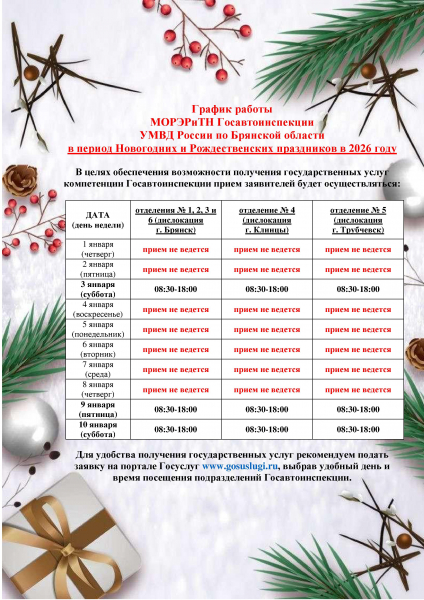 В целях обеспечения возможности получения государственных услуг Госавтоинспекцией Брянской области разработан график работы отделений МОРЭРиТН в период новогодних и рождественских праздников в 2026 году.