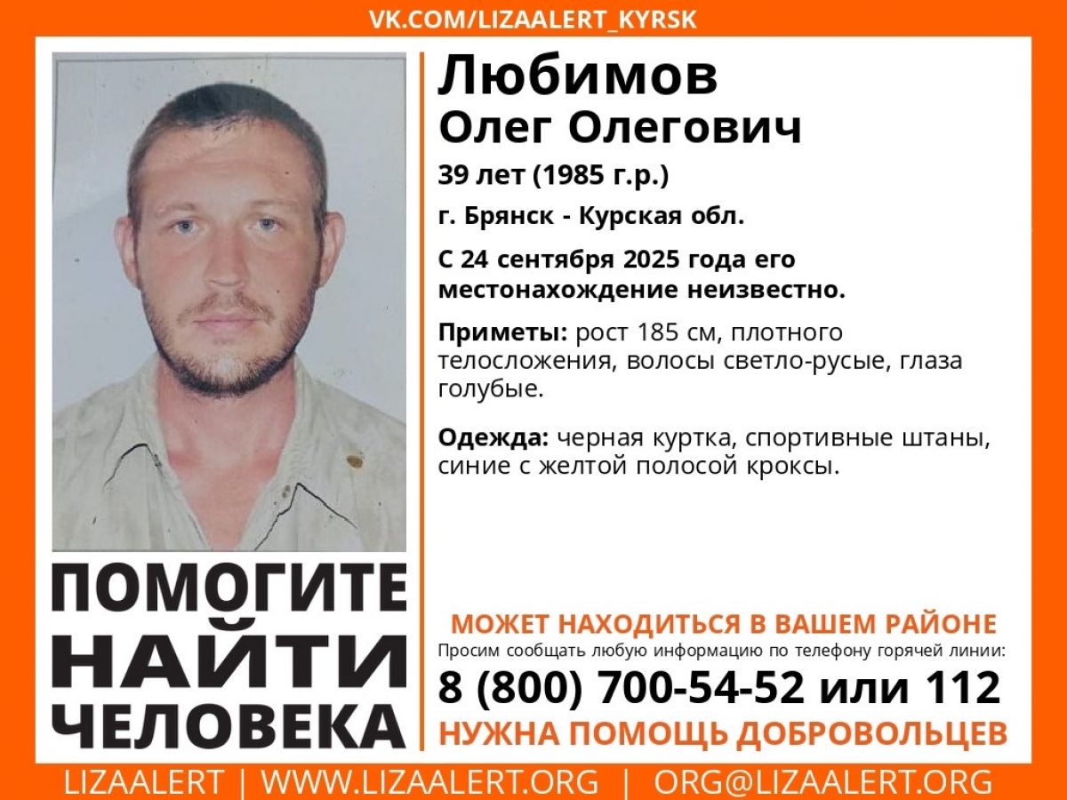 Жителей Брянской области просят помочь в поисках 39-летнего Олега Любимова. С 24 сентября о его местонахождении ничего не известно.