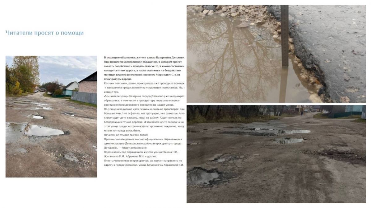 После публикации в газете «Дятьковский вестник» о ненадлежащем состоянии автодороги по улице Базарной прокуратурой Дятьково была проведена проверка.