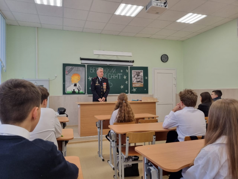 Выступая перед учащимися среднего звена, Вячеслав Иванович рассказал ребятам о своем профессиональном пути – служба в армии и правоохранительных органах, а также о командировке на Северный Кавказ.