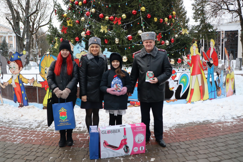 У празднично украшенной главной новогодней ёлки города Алексей Юрьевич и Наталья Васильевна подарили девочке самокат, о котором Ангелина мечтала и о котором просила Дедушку Мороза, и сладкий подарок. Приятным сюрпризом для полицейских стали неожиданные подарки от Ангелины – символ наступающего года, выполненный в технике алмазной мозаики.