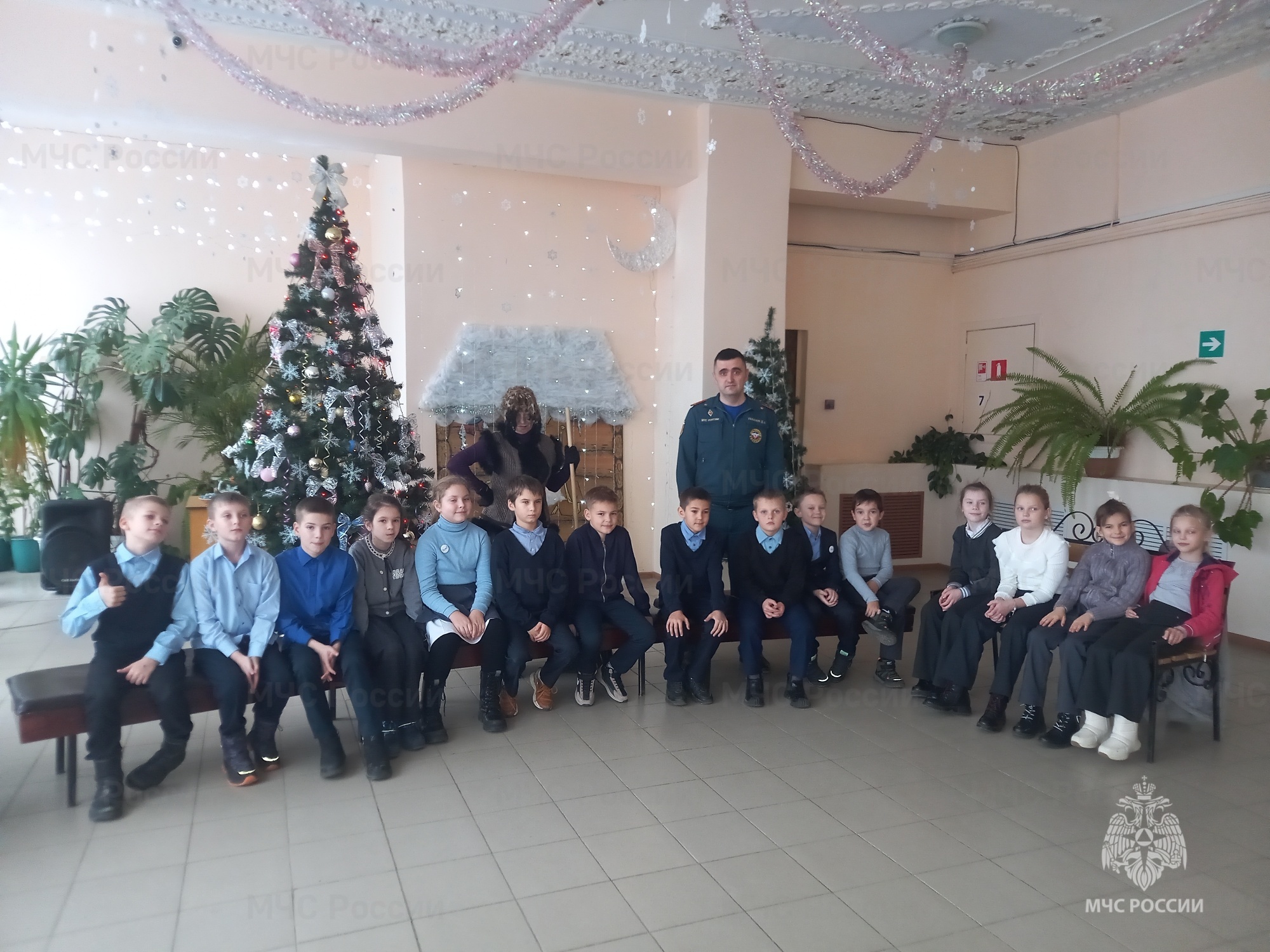 Инспектор ГПН провел занятие по пожарной безопасности и инструктаж о порядке действий в случае возникновения пожара. Он напомнил ребятишкам о необходимости соблюдения требований пожарной безопасности как в местах с массовым пребыванием людей, так и в быту. Далее сотрудник спасательного ведомства вместе с учащимися обсудили правила использования елочных гирлянд и бенгальских огней.
