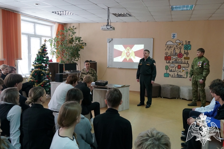 Офицеры рассказали старшеклассникам об этапах становления ведомства, задачах, стоящих перед войсками национальной гвардии Российской Федерации, об участии росгвардейцев в специальной военной операции и героических поступках военнослужащих и сотрудников войск правопорядка.