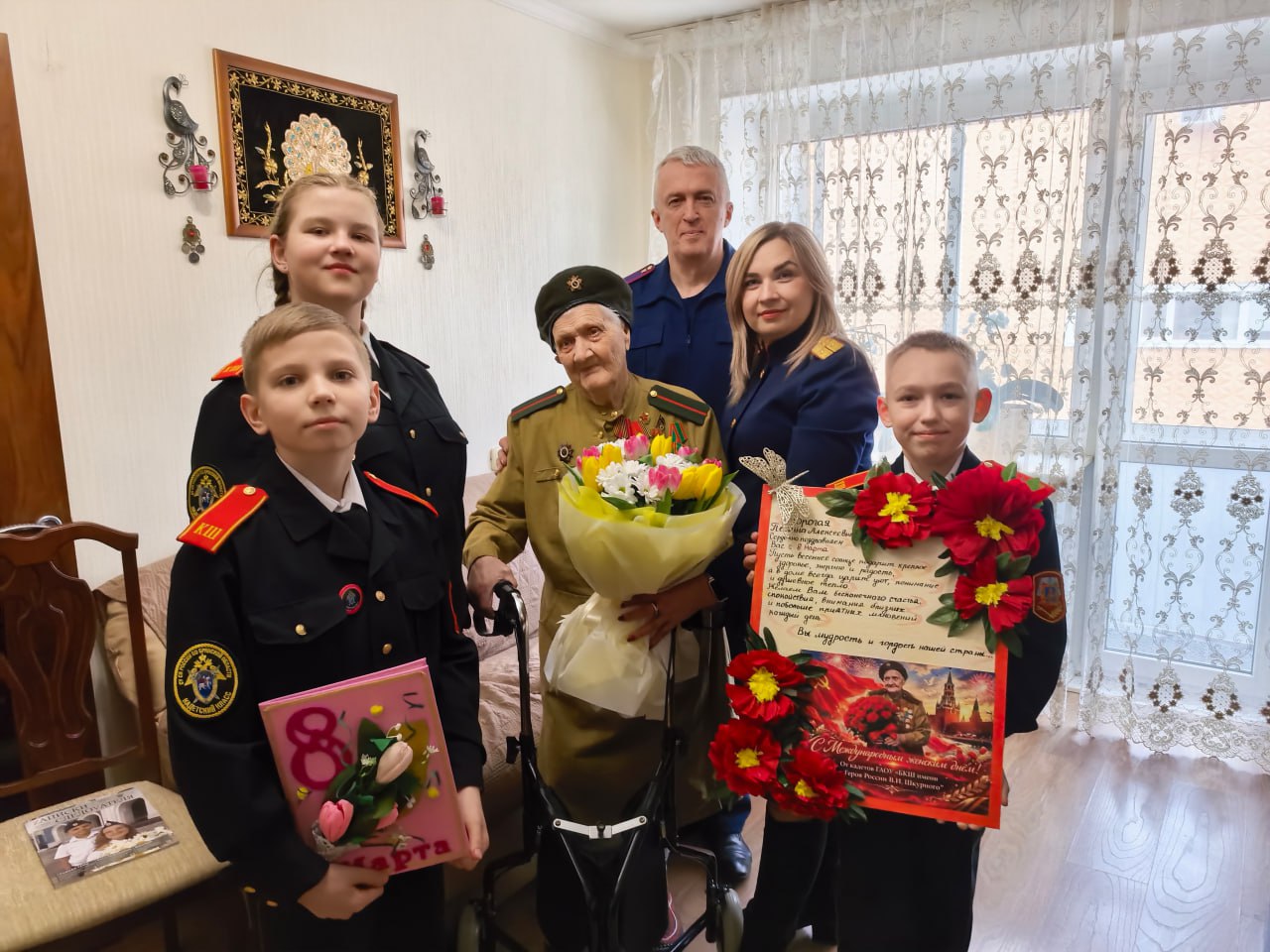 Исполняющий обязанности руководителя следственного управления СК России по Брянской области и кадеты ведомства поздравили с Международным женским днем ветерана Великой Отечественной войны