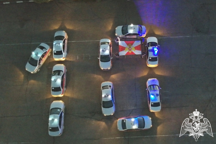 Автомобили вневедомственной охраны выстроились в определенном порядке и образовали огромную цифру «10», а сотрудники развернули большой флаг Росгвардии. Символичный перформанс был запечатлен с высоты птичьего полета.