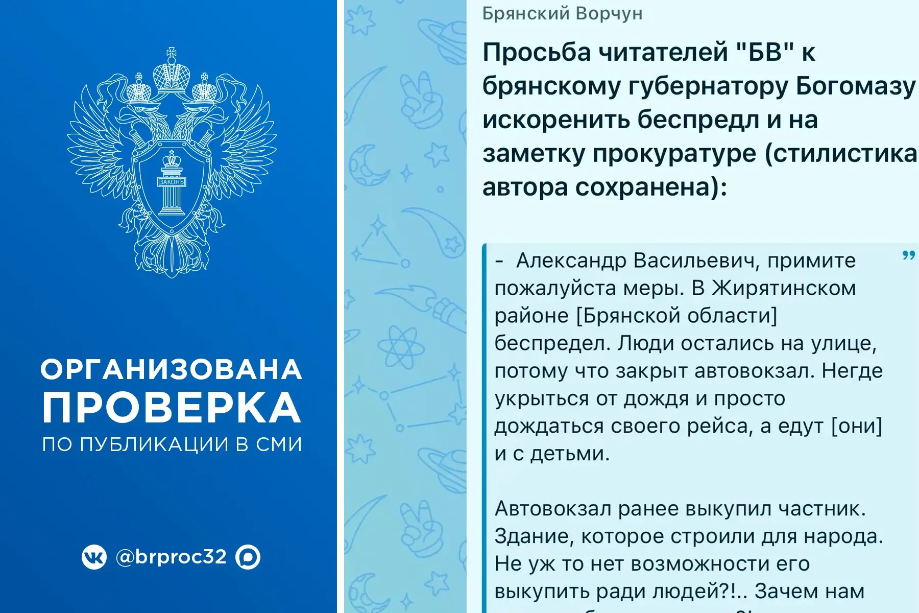 Прокуратура Жирятинского района организовала проверку по публикации в СМИ о том, что в с. Жирятино отсутствует автовокзал, в связи с чем пассажиры вынуждены ожидать транспорт на улице