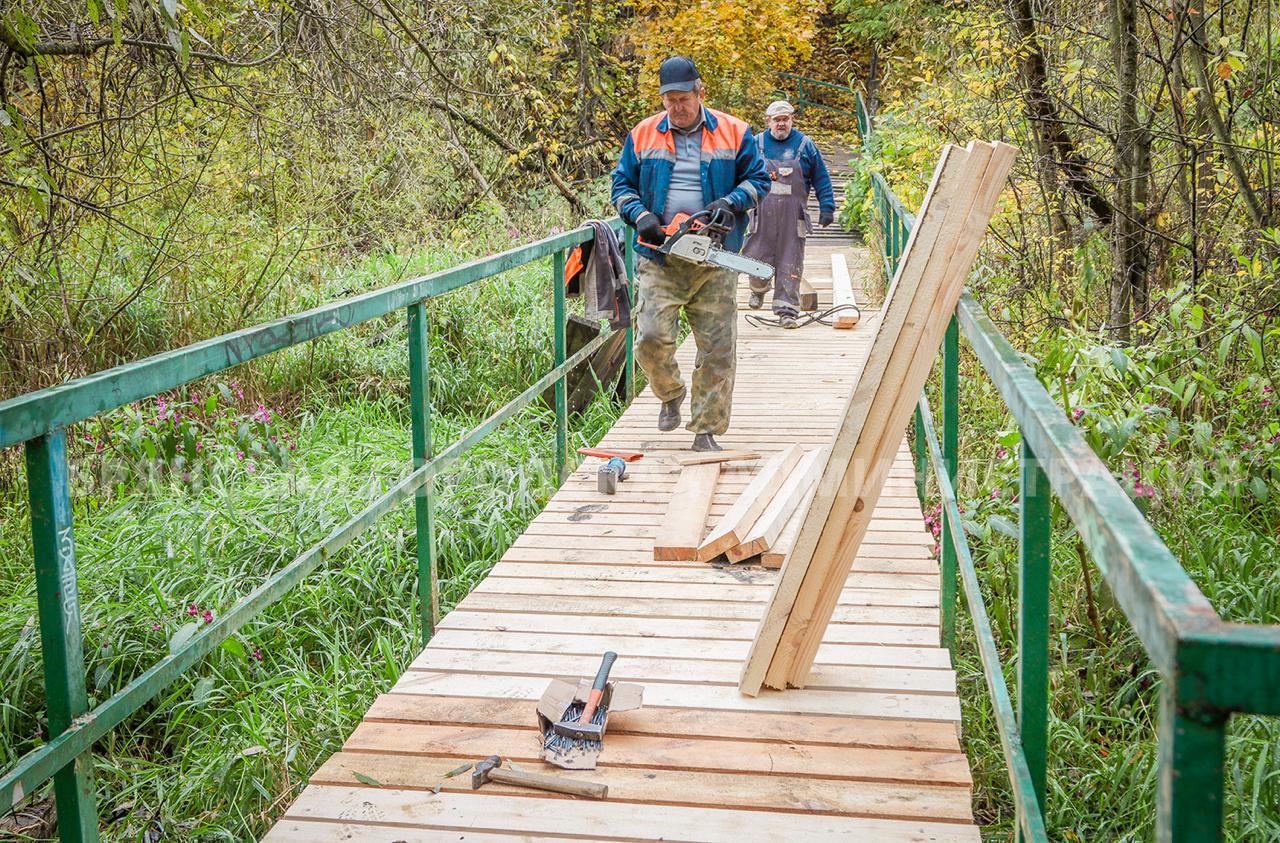 Для обновления лестницы используют более 20 метров бруса и не менее кубометра досок, обработанных антисептиком — ремонт планируется завершить до конца недели.