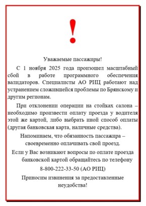Он возник с 01.11.2025 года, пишет Брянское троллейбусное управление. Стало некорректно функционировать программное обеспечение валидаторов.