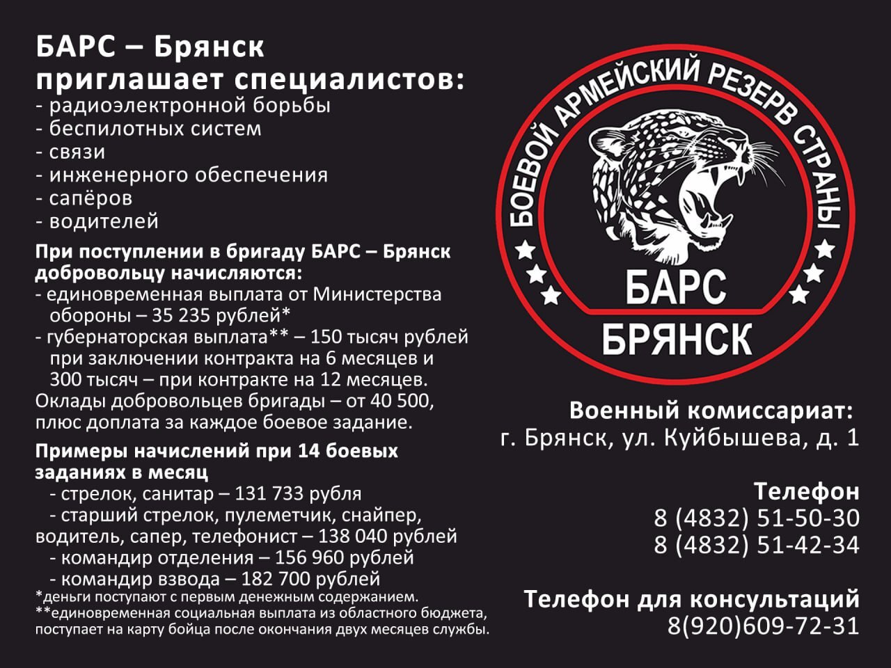 Добровольческий отряд «БАРС-Брянск» приглашает профессионалов. Обратиться можно в любой военный комиссариат. Адрес военкомата в столице региона: г. Брянск, ул. Куйбышева, д. 1.
