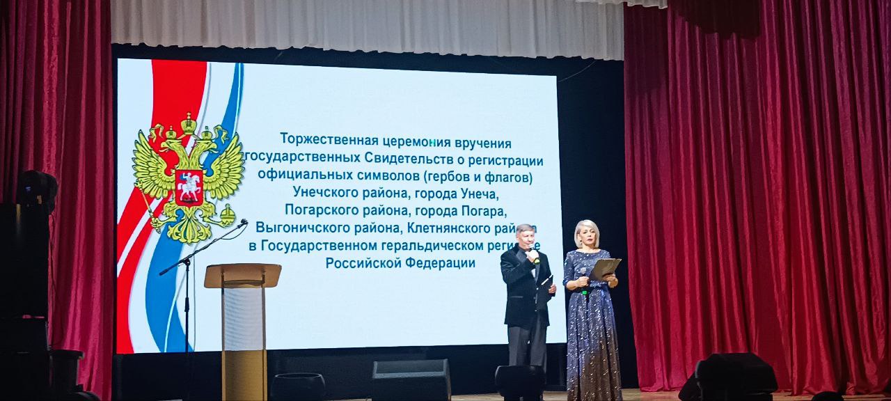 Сегодня в в МУК «Клуб им. 1 Мая» Унечского района состоялось торжественная церемония вручения государственных Свидетельств о внесении официальных символов Погарского района и Погарского поселения, в Государственный геральдический регистр Российской Федерации. Свидетельства вручал Президент Евразийского гербового центра Юрий Юрьевич Росич. Наряду с Погарским районом официальные символы получили Унечский, Выгоничский и Клетнянский районы. Юрий Юрьевич в своем выступлении отметил важность официального оформления гербов муниципальных образований, эта работа останется на века. И самый старинный герб оказался в городском поселении Погар. Он был пожалован императрицей Екатериной II в 1782 году.