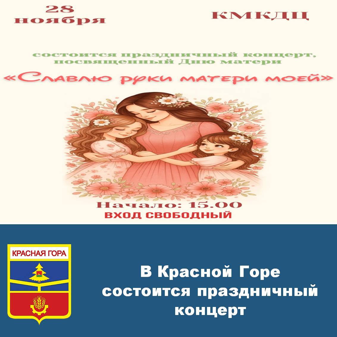 28 ноября 2025 года в 15.00 часов в Красногорском межпоселенческом культурно-досуговом центре состоится праздничный концерт «Славлю руки матери моей», посвященный Дню матери. Вход свободный.
