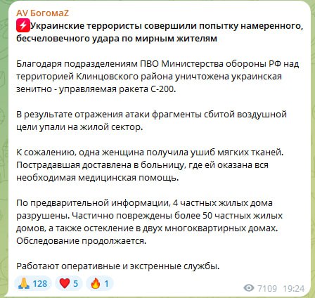 Губернатор Брянской области сообщает, что была сбита зенитная ракета комплекса С-200, которую украинские террористы используют для ударов по земле. Из-за обломков было уничтожено четыре дома, но о погибших не сообщается.