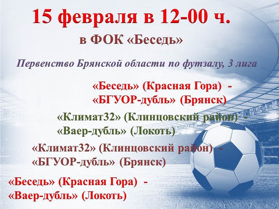 15 февраля 2026 года в физкультурно-оздоровительном комплексе «Беседь» состоится турнир по футзалу. Начало в 12-00 часов.