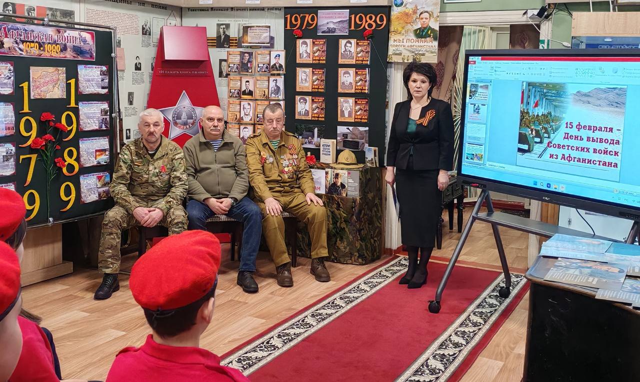 В начале мероприятия директор музея Е.Ф. Нешкова рассказала ребятам кто же такие воины-интернационалисты, что после Второй мировой войны 1,5 миллиона наших граждан принимали участие более чем в 30 вооруженных конфликтах за пределами страны, 25 тысяч из них, к сожалению, погибли.