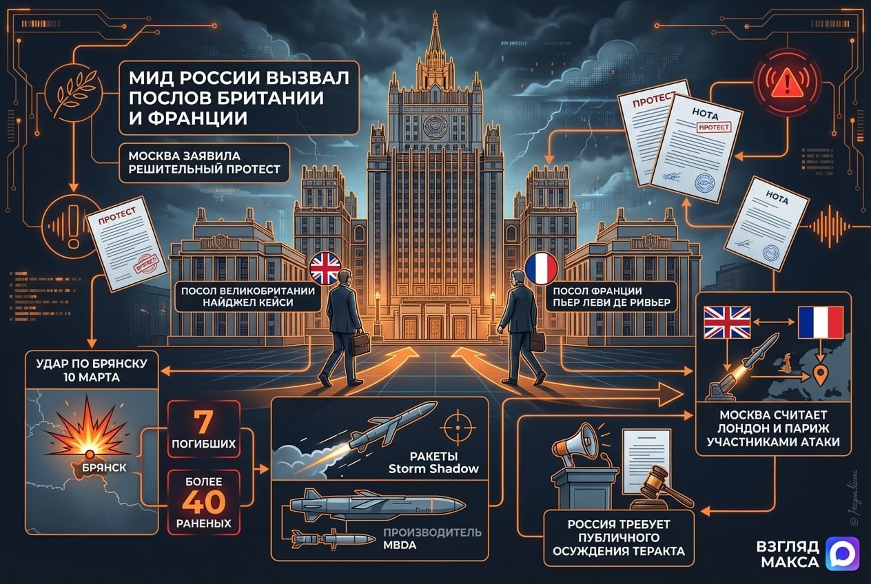 В МИД России сегодня официально были вызваны посол Великобритании в Москве Найджел Кейси и посол Франции в Москве Пьер Леви де Ривьер. Им был заявлен решительный протест в связи с ударом ВСУ по Брянску 10 марта крылатыми ракетами производства франко-британского концерна MBDA.