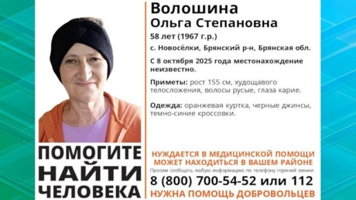 В Брянском районе пропала без вести 58-летняя жительница села Новосёлки Ольга Волошина, об этом сообщили в поисковом отряде «Лиза Алерт».