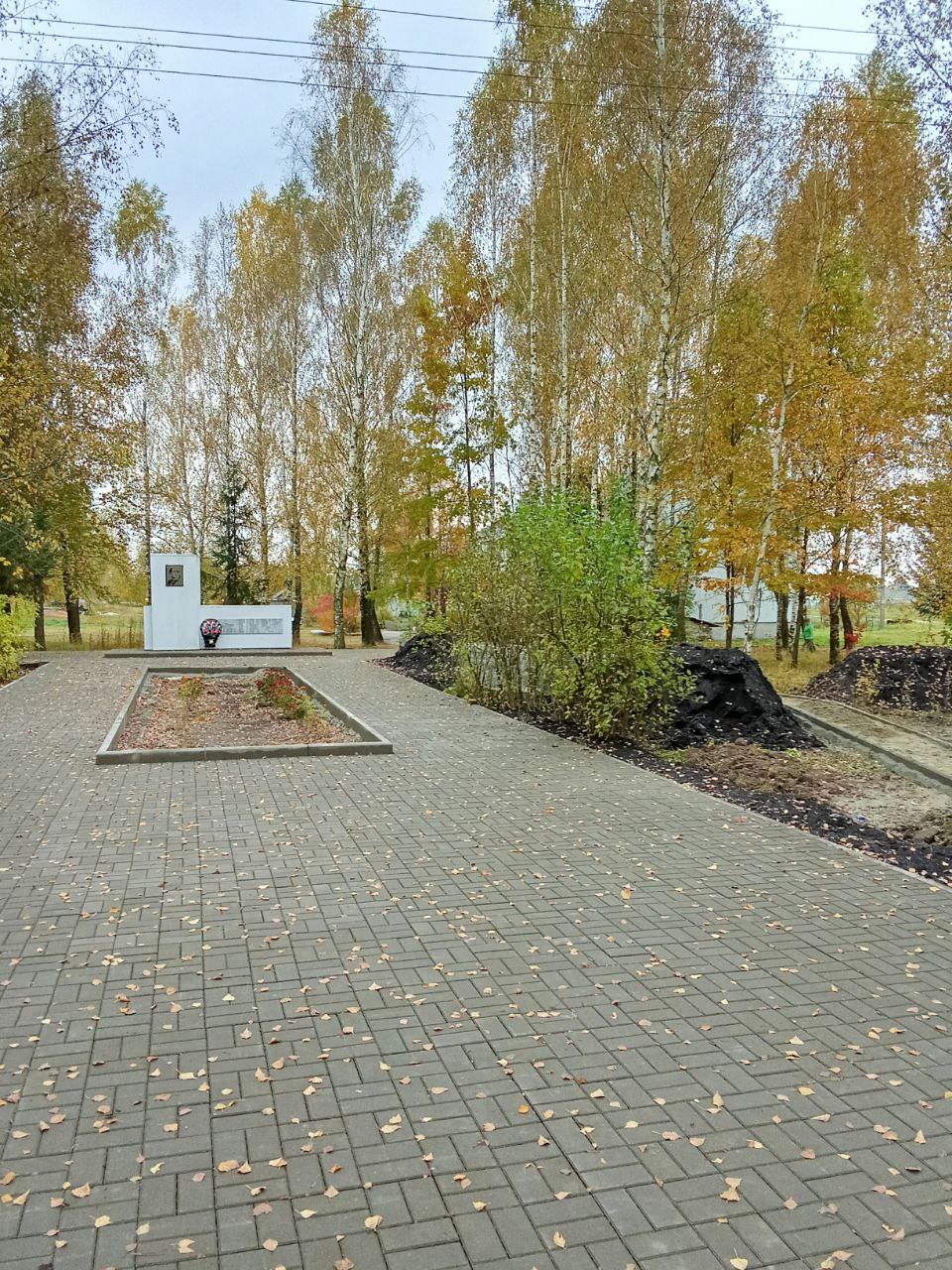 Уложена тротуарная плитка возле памятника, продолжается устройство тротуарных дорожек и засыпка грунтом цветника и газонов.