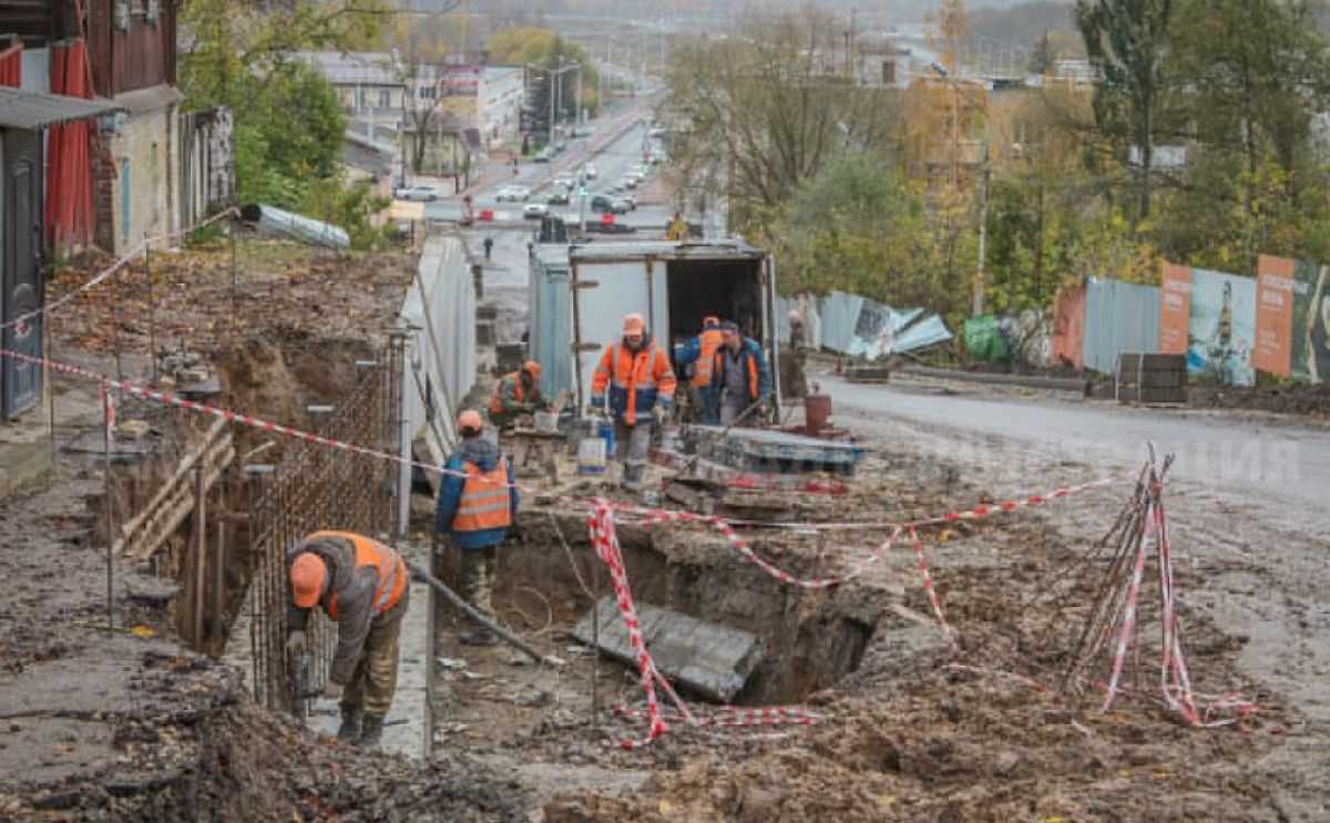 Заканчивается возведение подпорной стены. В общей сложности построят 180 метров железобетонного укрепления откосов. После завершения этих работ над стеной также появится тротуар. На перекрёстке улиц Горького и Калинина вокруг одной из электрических опор строители оборудуют разделительную полосу.