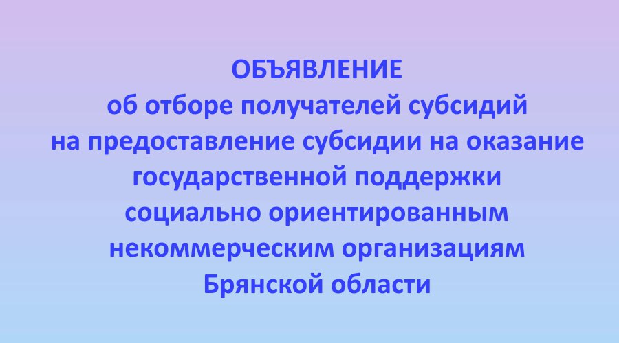 Региональный департамент внутренней политики информирует о проведении отбора получателей субсидий на предоставление субсидии на оказание государственной поддержки социально ориентированным некоммерческим организациям Брянской области.