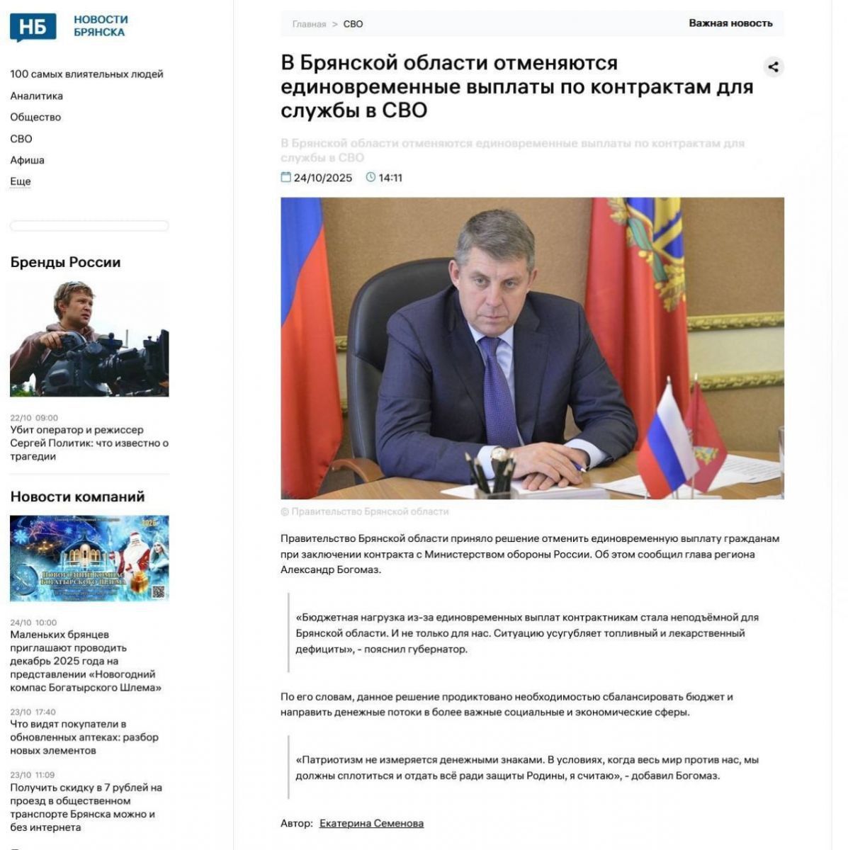 Дизайн и логотип сайта "Новостей Брянска" были использованы для создания фейковой публикации, в которой утверждалось, что правительство региона якобы отменяет выплаты участникам СВО, заключившим контракт на военную службу. Редакция официально опровергает эту недостоверную информацию и подчеркивает, что весь контент перед публикацией тщательно проверяется.