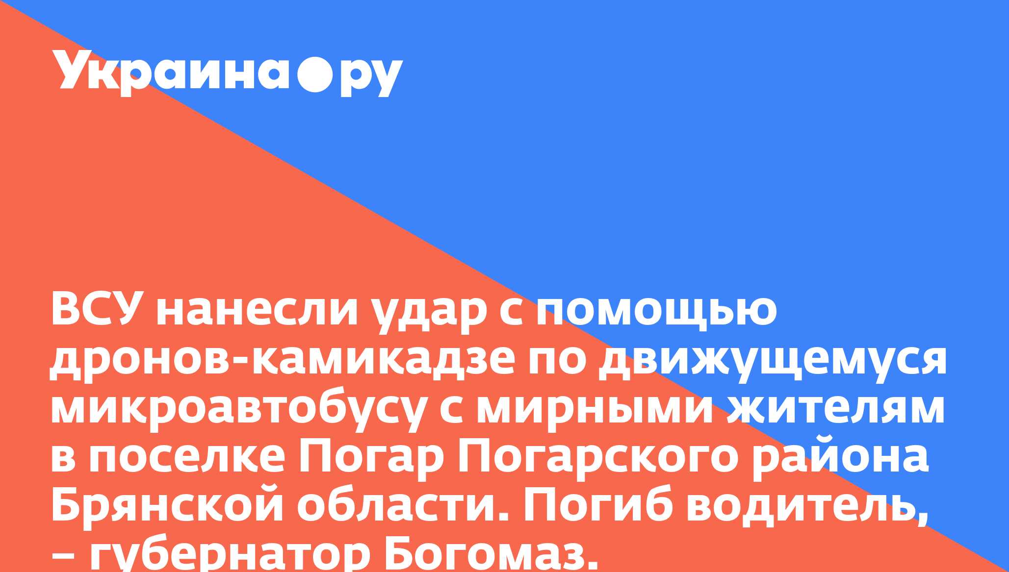Губернатор Брянской области Александр Богомаз сообщил, что беспилотник Вооруженных сил Украины атаковал микроавтобус с гражданскими лицами. По его словам, инцидент произошел в поселке Погар Погарского района, в результате погиб...