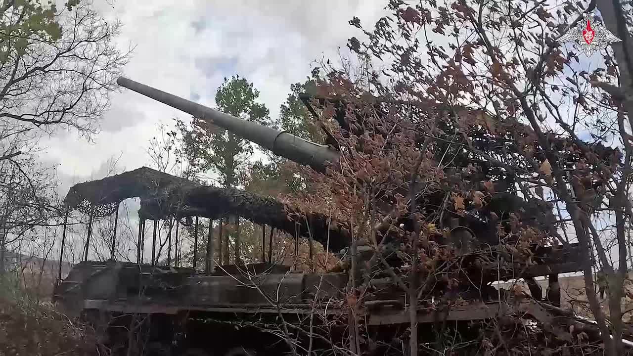 На этих кадрах расчет САУ «Пион» ГрВ «Запад» уничтожает пункт временной дислокации, оборудованные огневые позиции и наблюдательные пункты ВСУ.