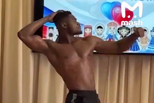 На кадрах уроженец Уганды позирует на фоне телевизора, на экран которого выведено изображение, напоминающее о празднике, отмечаемом 4 ноября. Темнокожий мужчина проводит рукой по прессу, затем показывает свои мускулы.