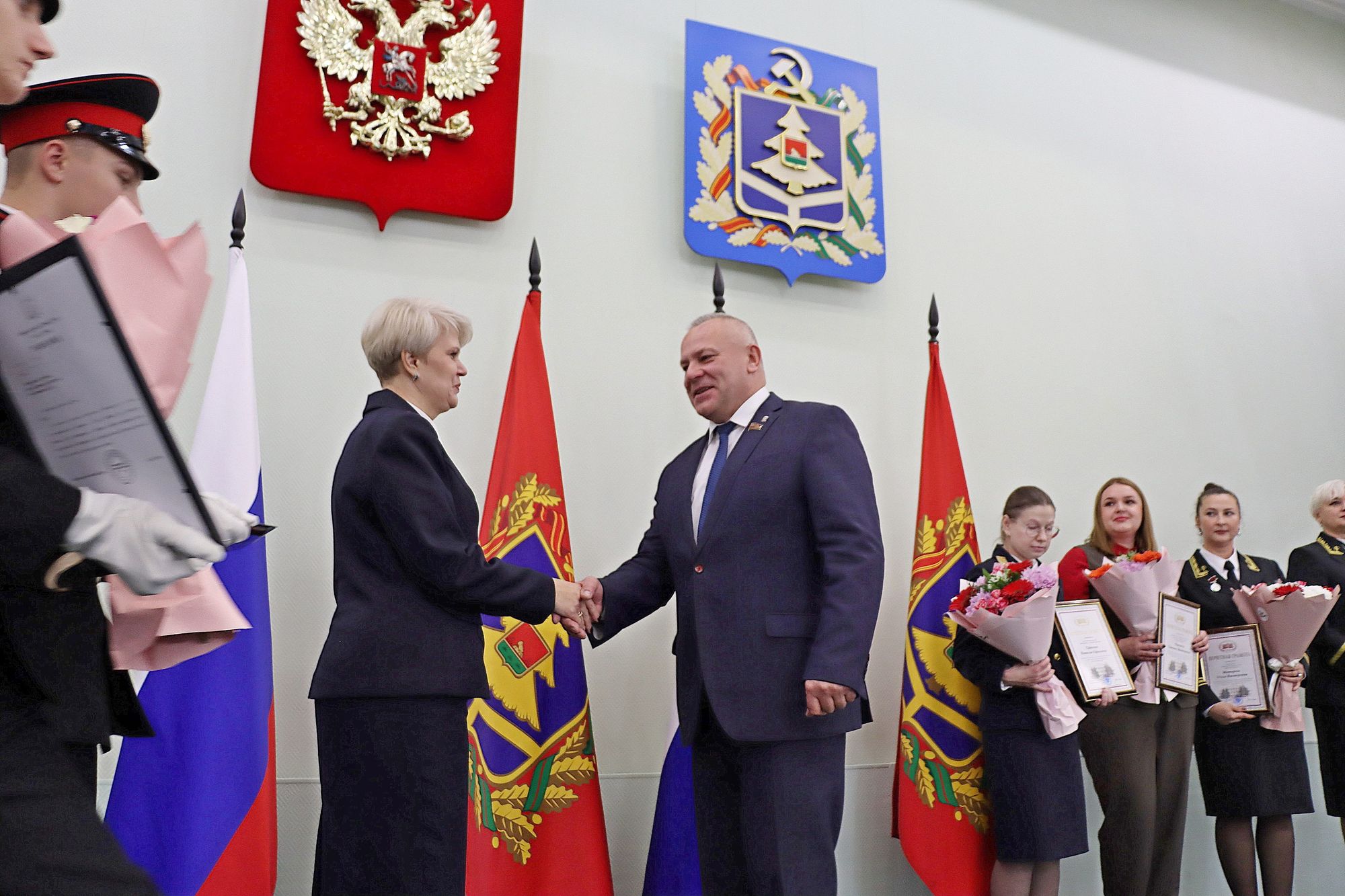 На праздничное мероприятие в Хрустальном зале Правительства региона собрались: Губернатор Александр Богомаз, председатель Брянской областной Думы Валентин Суббот, главный федеральный инспектор по Брянской области Андрей Дьячук, сенаторы Российской Федерации Василий Попадайло и Вадим Деньгин, депутаты Государственной Думы ФС РФ Николай Валуев и Николай Щеглов, председатель Брянского областного суда Александр Курганов, председатель Арбитражного суда Брянской области Евгений Егоров, заместители Губернатора, работники судебной системы региона, представители органов власти, силовых структур и ведомств, духовенства.