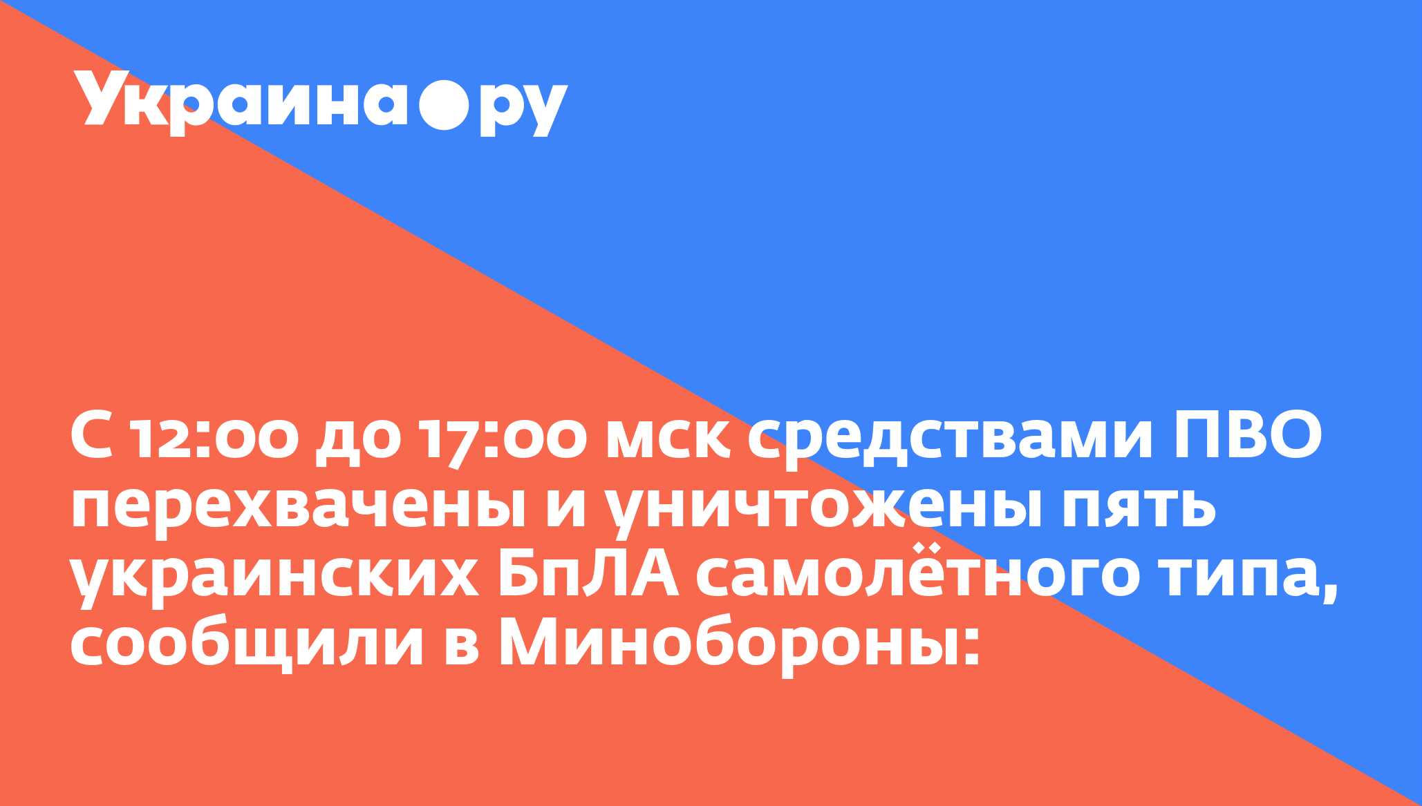 С 12:00 до 17:00 мск средствами ПВО перехвачены и уничтожены пять украинских БпЛА самолётного типа, сообщили в Минобороны:
