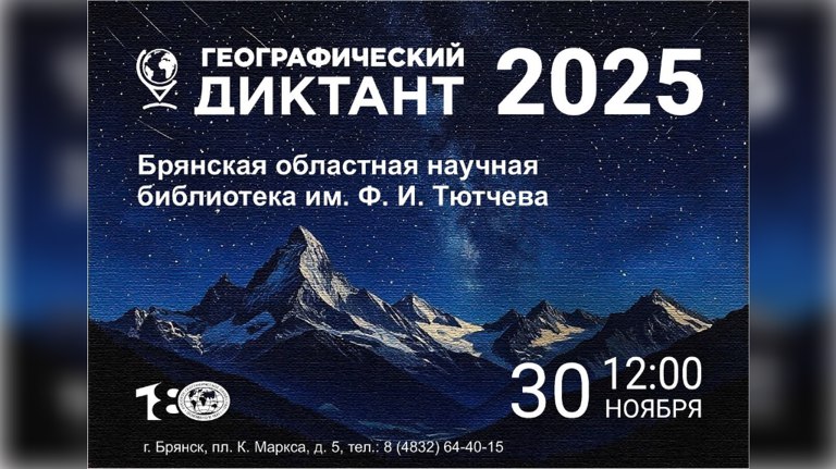 30 ноября в Брянской областной научной библиотеке имени Ф. И. Тютчева состоится очная международная просветительская акция «Географический диктант» Русского географического общества, направленная на популяризацию знаний о географии России.