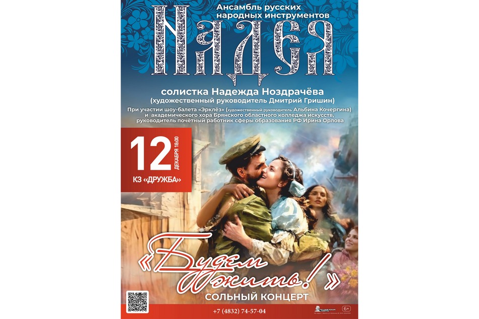 12 декабря на сцене концертного зала «Дружба» Брянской областной филармонии состоится сольный концерт ансамбля русских народных инструментов «Надея» и солистки Надежды Ноздрачевой «Будем жить».