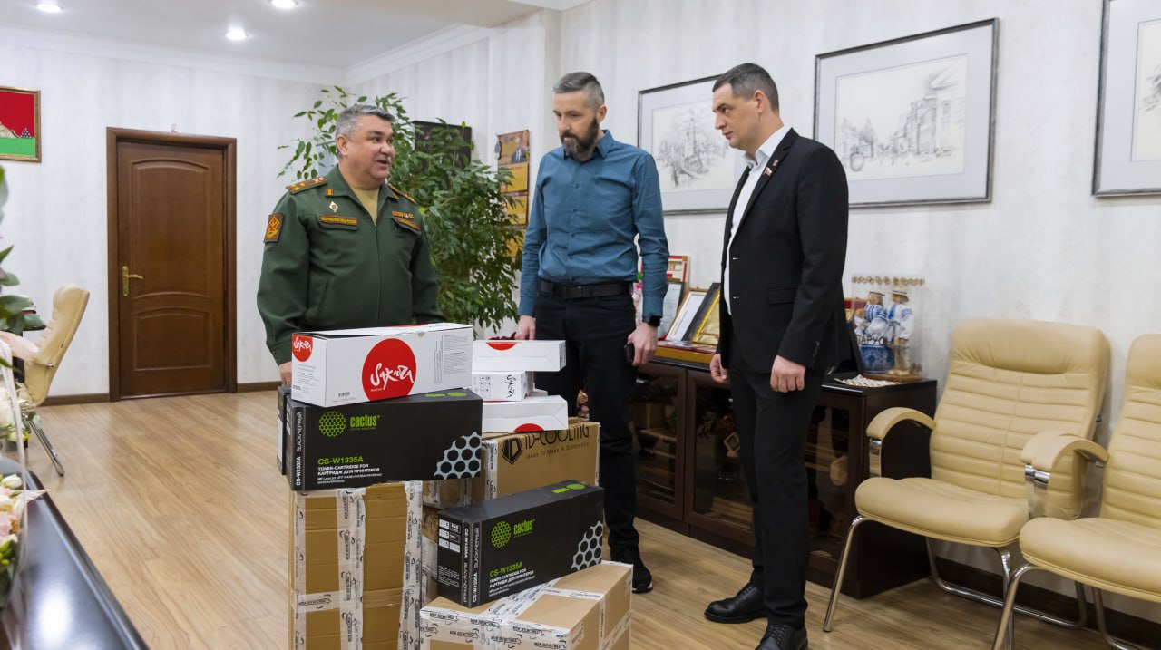 Депутаты Брянского городского Совета Валентин Николаев и Дмитрий Баранчиков в рамках оказания гуманитарной помощи передали партию картриджей для многофункциональных устройств руководителю Военного комиссариата Брянской области полковнику Ильфату Исхаковичу Абзалову.