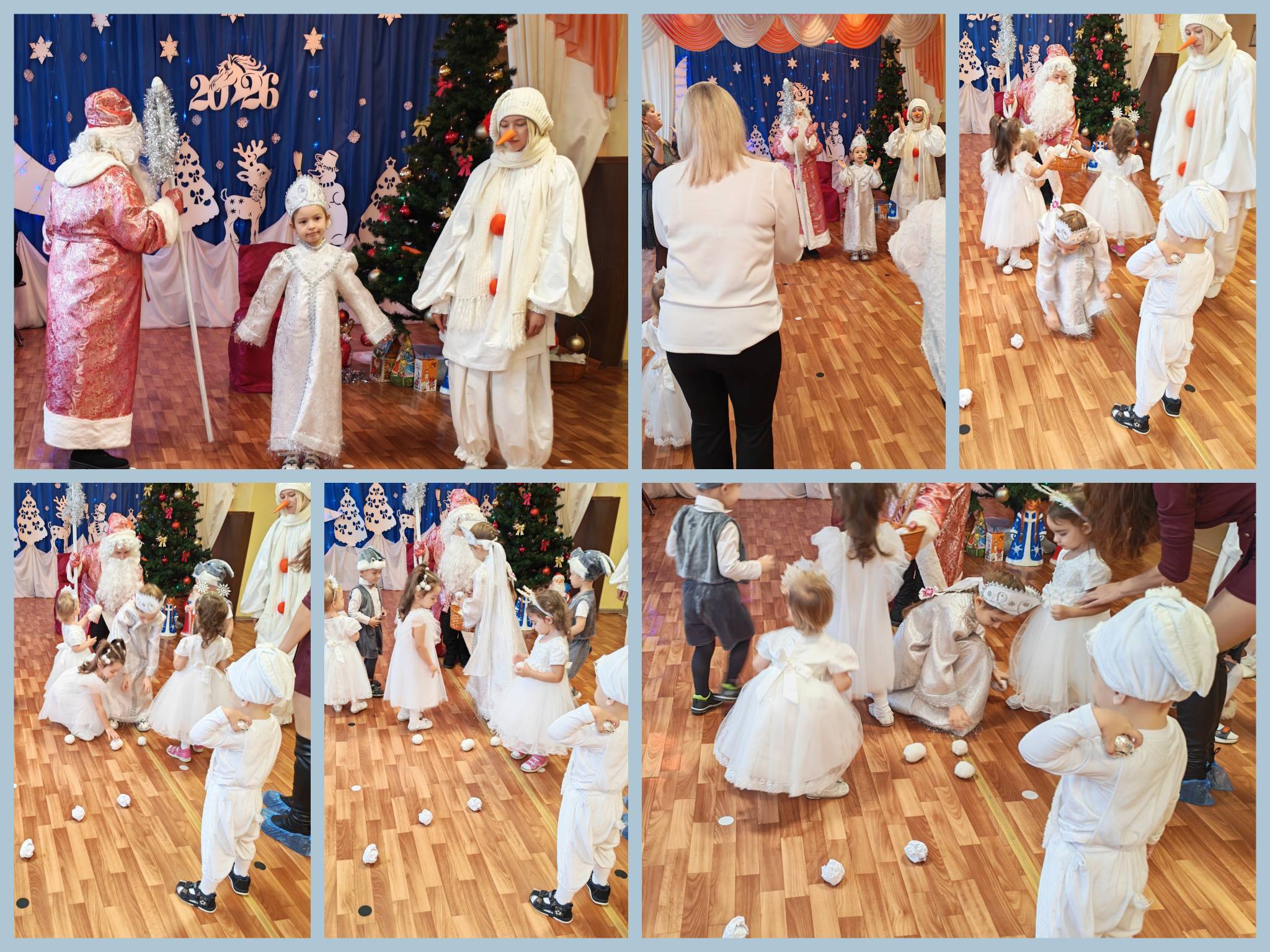 Малыши в костюмах Снежинок и Зайчиков с восторгом встречали Деда Мороза, Снегурочку и весёлого Снеговика. Возле нарядной ёлки звенели детские голоса: ребята водили хороводы, играли в снежки и пели песенки о зиме и Новом годе.