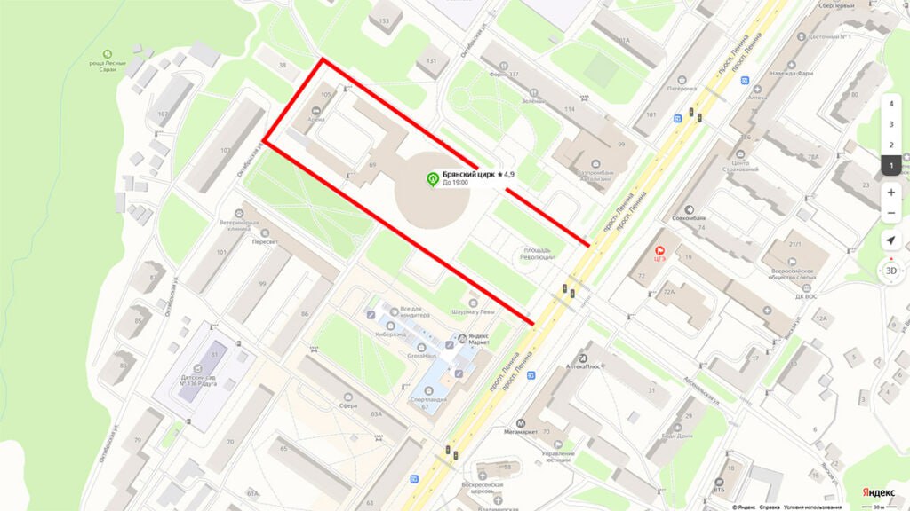 — от проспекта Ленина до улицы Октябрьской (вдоль здания Брянского государственного цирка, в том числе на парковке, прилегающей к Дому быта по пр-ту Ленина, 67);