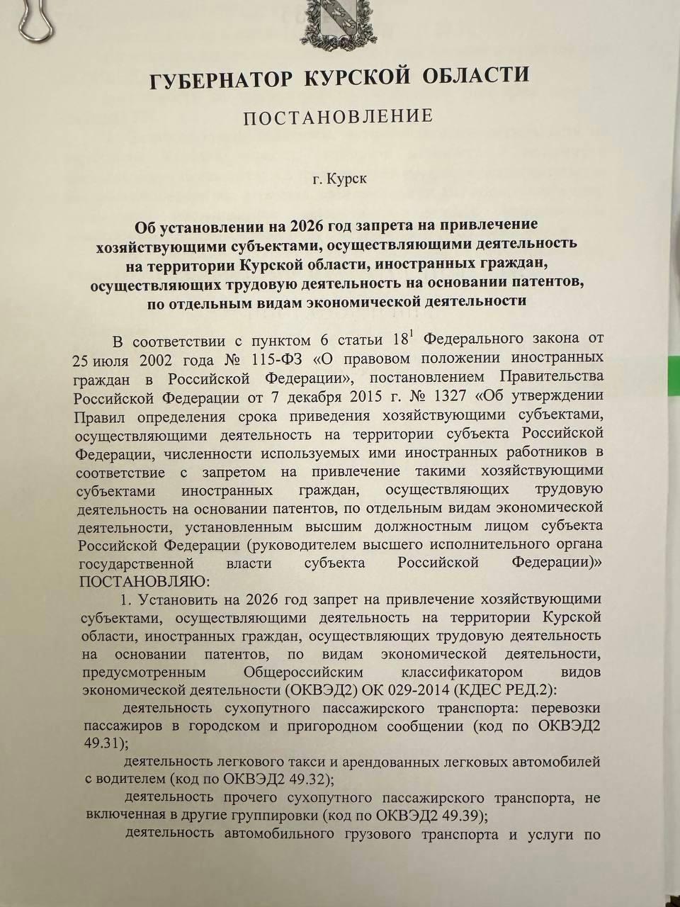 Губернатор Курской области Александр Хинштейн подписал постановление о запрете на работу мигрантов в отдельных сферах.