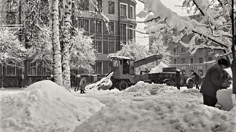 Фотография 1970 года раскрывает детали зимней жизни города, когда техника и люди трудились над уборкой снега.