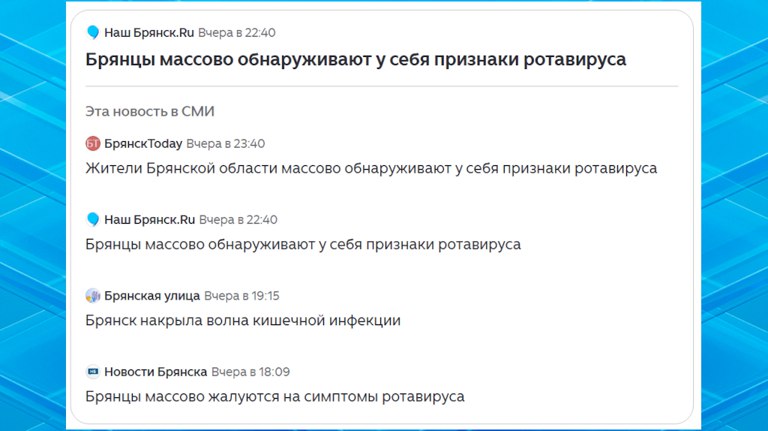 Накануне четыре негосударственных или, как они себя еще позиционируют, независимых интернет-ресурса, имеющих между прочим лицензию Роскомнадзора на осуществление соответствующей деятельности, друг за другом бросились пугать брянцев о якобы имеющихся у них симптомах ротавирусной инфекции.