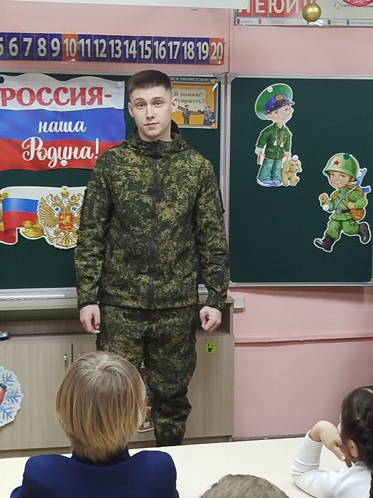 В СОШ №7 прошла классная встреча «Новое время – новые герои» с участником специальной военной операции Зык Д.К., который сейчас находится в краткосрочном отпуске.