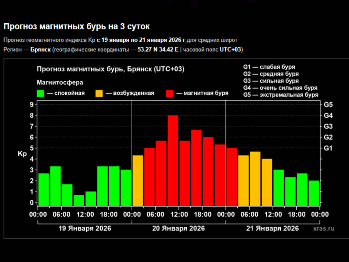 «Штормить» начнёт в районе полуночи. Постепенно колебания будут нарастать. К 03:00 магнитная буря достигнет уровня G1, а к 09:00 - уже G4. Затем К-индекс немного снизится: до 5,5-6,8 баллов. Ситуация нормализуется лишь ночью 21 января.