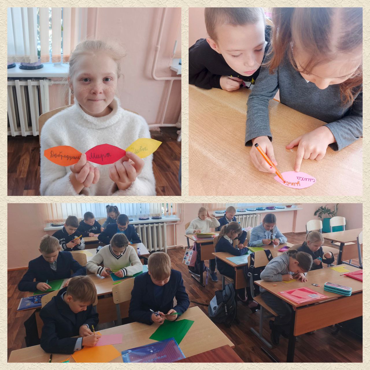 На белой доске мы изобразили дерево без листьев — символ надежды и обновления. Каждый из учащихся создавал яркие листочки из цветной бумаги, на которых писали свои пожелания мира и добра и прикрепили к дереву, символизируя рост доброты. В итоге дерево запестрело нашими добрыми мыслями и намерениями.